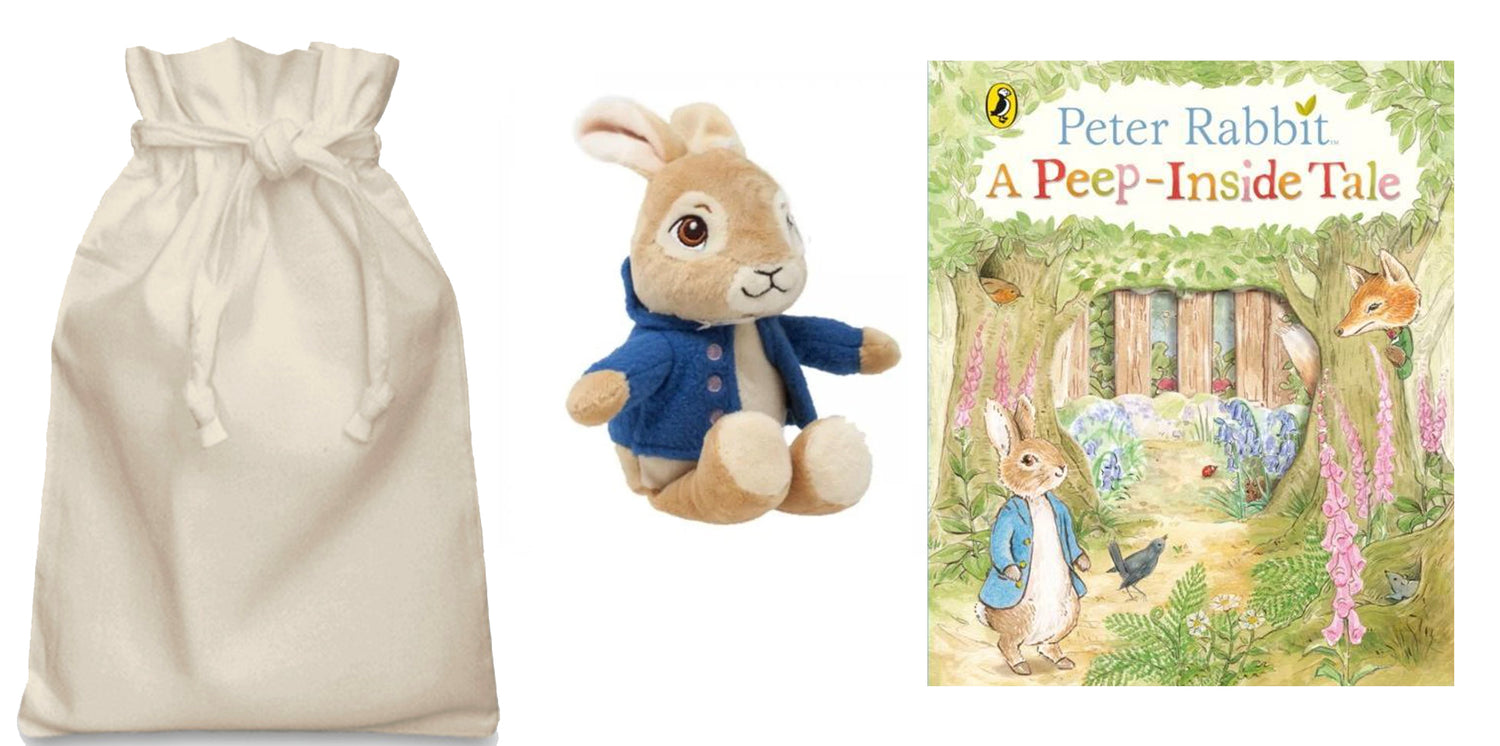 Peter Rabbit Soft Toy Story Sack.  Peter is going out on his adventures so he has put on his favorite Blue Jacket. We have teamed up this lovely soft toy with this gorgeous Peep Inside Book so you can take your Peter Rabbit on his adventures as you read the book.  Great toy to cuddle at bedtime too!