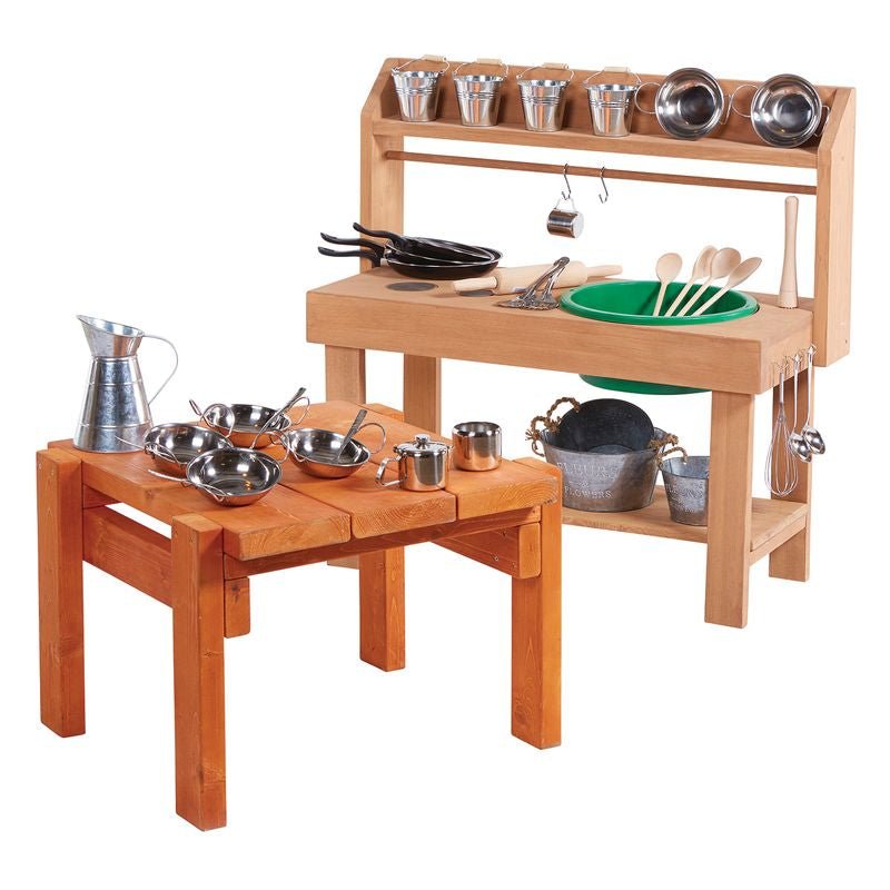 The complete set for setting up your own mud pie kitchen and cafe. Everyone loves to cook up a treat in the great outdoors now and this set provides all the tools you'll need, including furniture and utensils.
