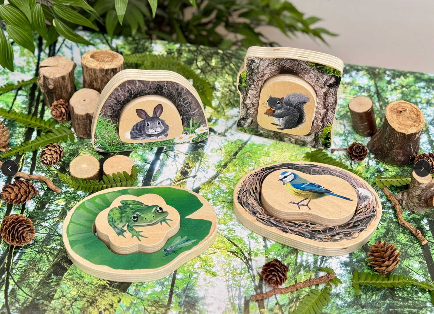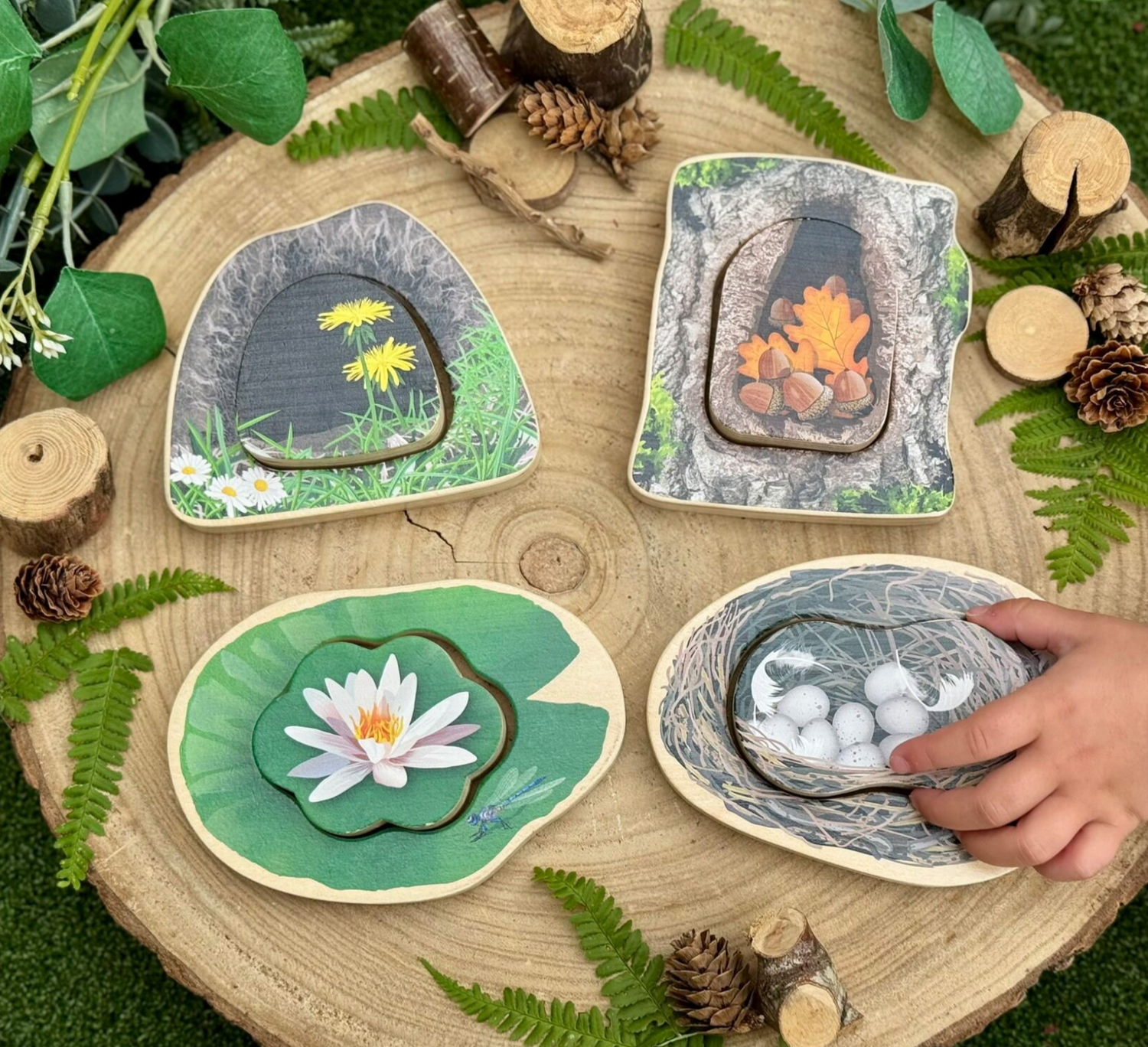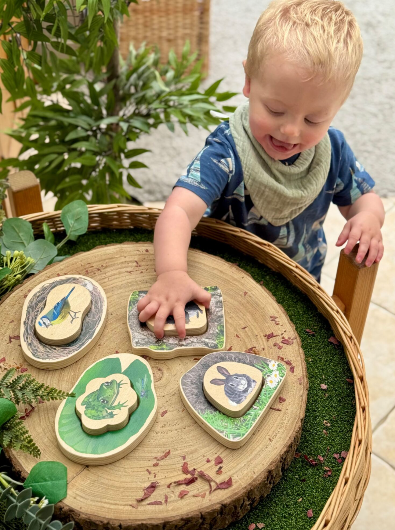 Perfect for hide-and-seek fun, the chunky wooden pieces can also stand upright, encouraging open-ended storytelling, imaginative play and early conversations about the natural world.